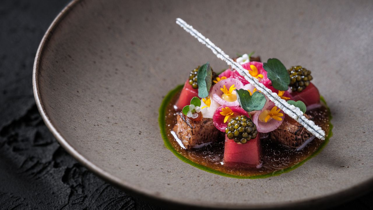 Thực đơn cho hai đêm trải nghiệm được xây dựng để dẫn dắt thực khách qua nhiều tầng vị giác khác nhau. Mở đầu là những món thanh vị như cá cam kết hợp gạo Koshihikari, củ cải và rong biển, hay gỏi cá tráp với bánh gạo chiên và trứng cá tầm.