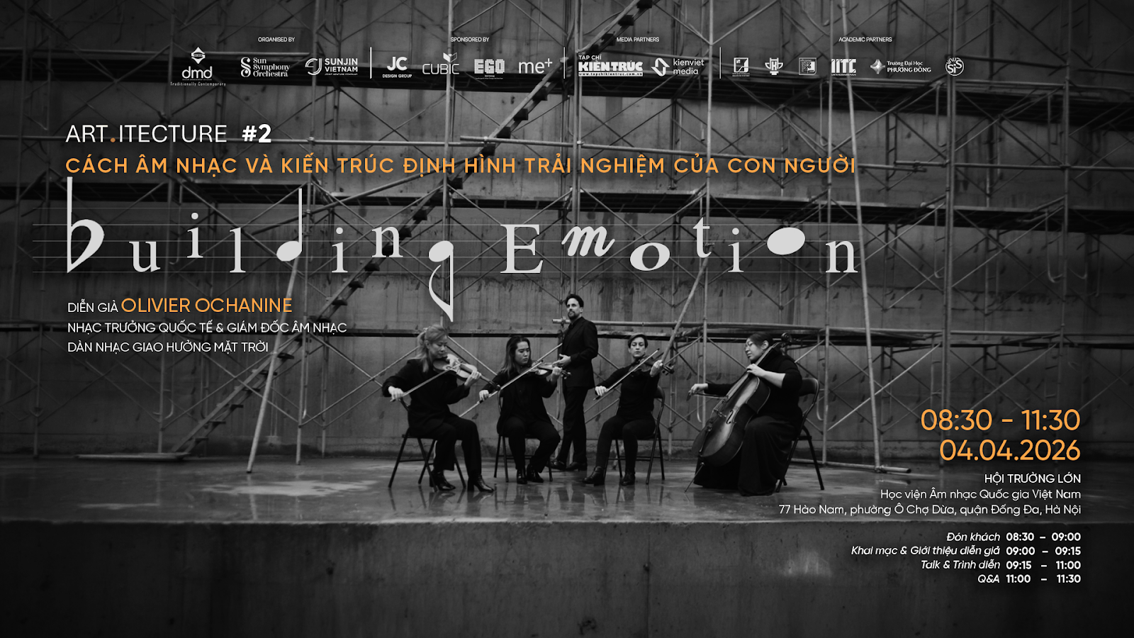 | Art.itecture #2 – Xây dựng cảm xúc: Cách âm nhạc và kiến trúc định hình trải nghiệm của con người Thời gian: 08:30 - 11:30 thứ Bảy, ngày 04.04.2026 Địa điểm: Hội trường lớn – Học viện Âm nhạc Quốc gia Việt Nam, 77 Hào Nam, phường Ô Chợ Dừa, quận Đống Đa, Hà Nội, Việt Nam Bản đồ: Vietnam National Academy of Music Ngôn ngữ sự kiện: Tiếng Anh có phiên dịch tiếng Việt. Để biết thêm thông tin, truy cập landing page: artitecturetalk.com ; Fanpage: https://www.facebook.com/Art.itecture.series/ |