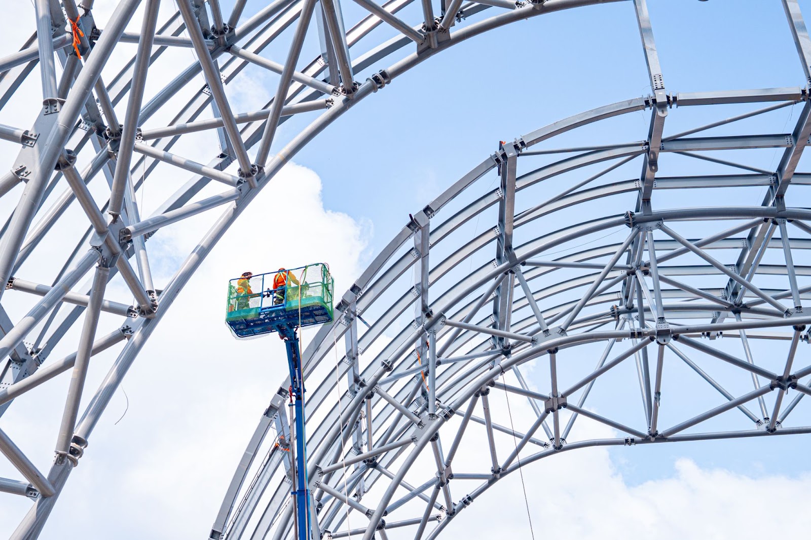 Không chỉ dừng ở quy mô, hệ kết cấu còn đòi hỏi độ chính xác gần như tuyệt đối. Các liên kết sử dụng bu lông cường độ cao cấp bền 10.9, kết hợp với các chốt thép gia công chính xác và hệ gối chịu lực được chôn sâu trong bê tông, đảm bảo khả năng chịu tải lớn và ổn định lâu dài cho toàn bộ công trình.
